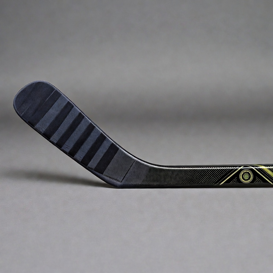 NHL, black stick, blade, emblem, equipment, field hockey, gold accents, grip, hockey equipment, ice hockey, isolated background, shaft, sports gear, textured, hockey stick