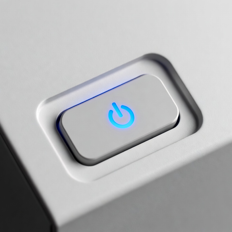 A close-up view of a white rectangular power button with a blue glowing power symbol. The button is embedded in a white surface with subtle beveling. The illumination highlights the universal on/off icon.