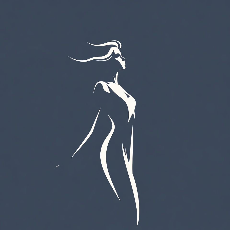 A minimalist white silhouette of a woman stands in profile against a dark navy background. Her long hair flows dramatically to the right, and her elegant figure features a fitted dress with one arm extended gracefully. The illustration emphasizes smooth curves and motion.