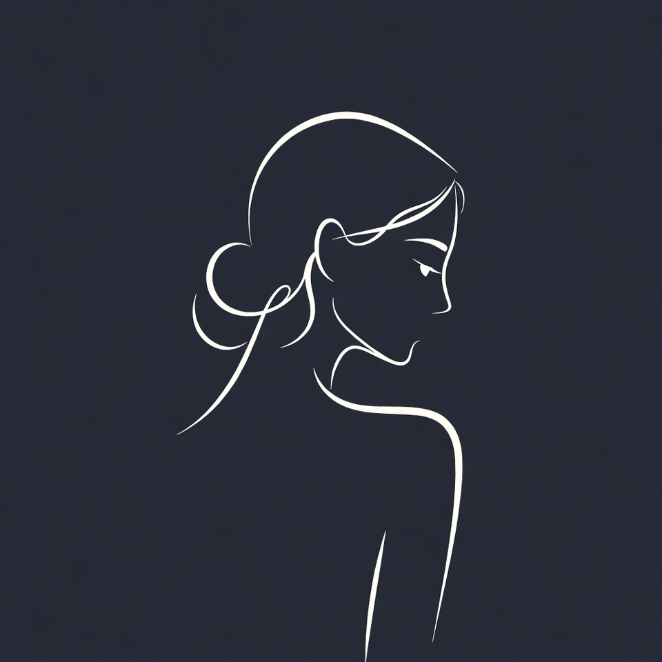 A minimalist white line art illustration of a woman's profile against a dark background. She has her hair styled in a bun and turns her head slightly to the side. The design features smooth, elegant curves outlining her face, hair, neck, and shoulder.