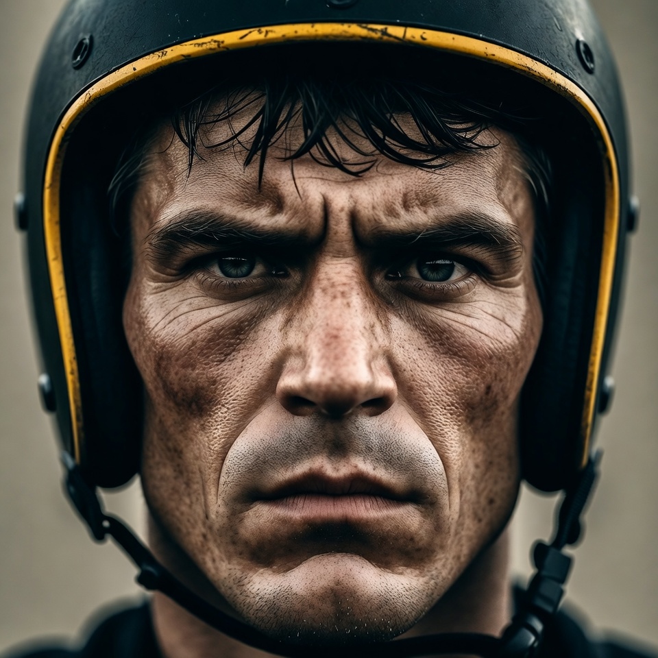 Man in black helmet intense stare