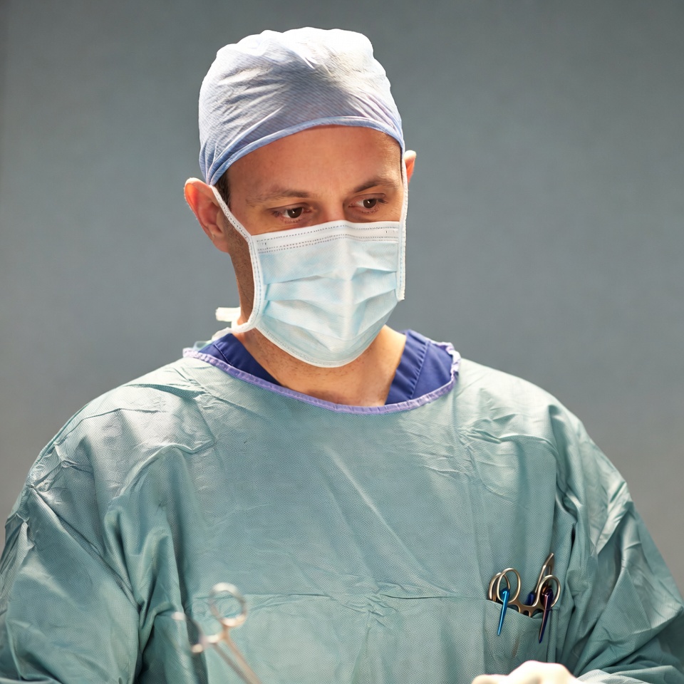 A male surgeon wearing light blue scrubs, surgical cap, and face mask stands against a gray background. He has surgical instruments clipped to his shirt pocket. His expression appears focused through the mask.