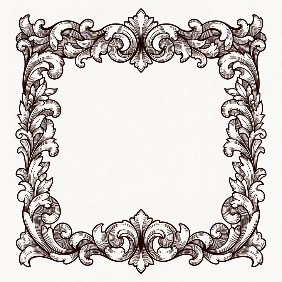 An intricate black line art frame features elaborate floral and scroll motifs in a vintage style. The symmetrical design surrounds a large empty white space in the center. Detailed engravings include leaves, curls, and decorative flourishes on all sides.