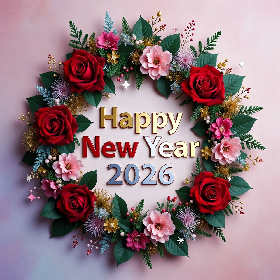 A vibrant floral wreath made of red roses, pink flowers, ferns, and gold ornaments encircles golden 'Happy New Year 2026' text. The design features sparkling stars and berries on a soft pink gradient background. It has a detailed, papercraft illustration style.