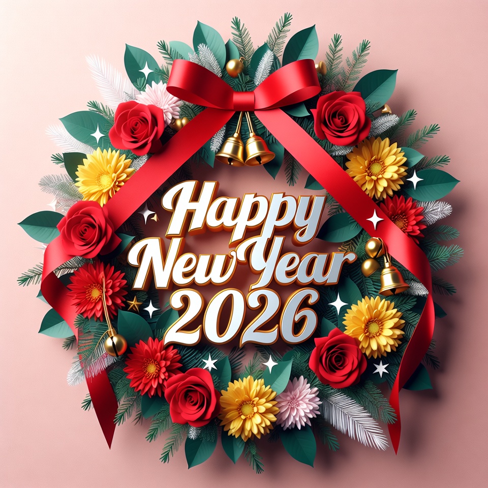 A colorful paper-cut style wreath features red roses, yellow daisies, green fir branches, and feathers arranged in a circular design. A large red ribbon bow with golden bells adorns the bottom. Bold white text reading 'Happy New Year 2026' is centered on a soft pink background.