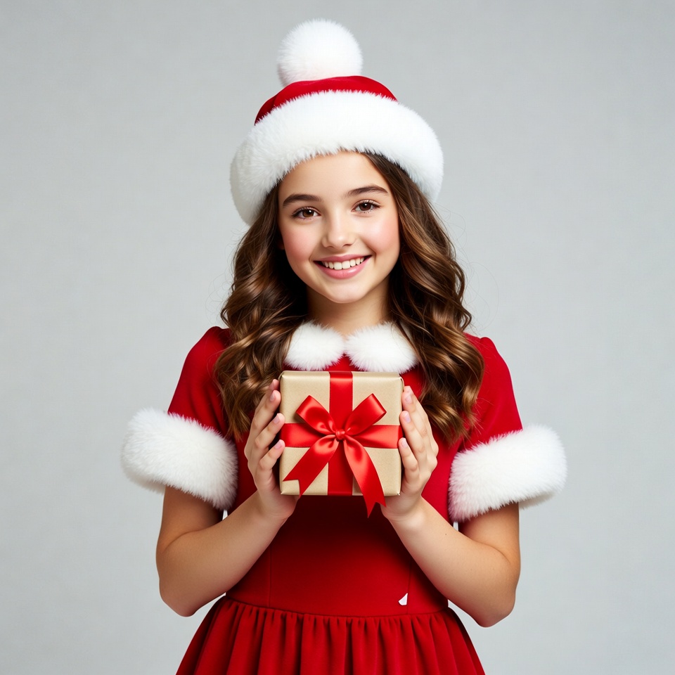 A young girl with long wavy brown hair smiles happily while holding a brown gift box topped with a red bow. She wears a festive red Santa dress with white fur trim on the collar, cuffs, and hem, along with a matching white-trimmed Santa hat. The image features a plain gray background.