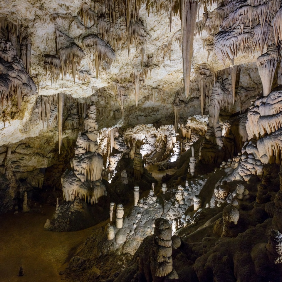 cave ceiling, cave floor, cavern, dripstone, exploration, geology, illuminated, karst, limestone, lit cave, mineral deposits, natural cave, rock formations, speleothem, stalactites, stalagmites, underground, white rocks, cave