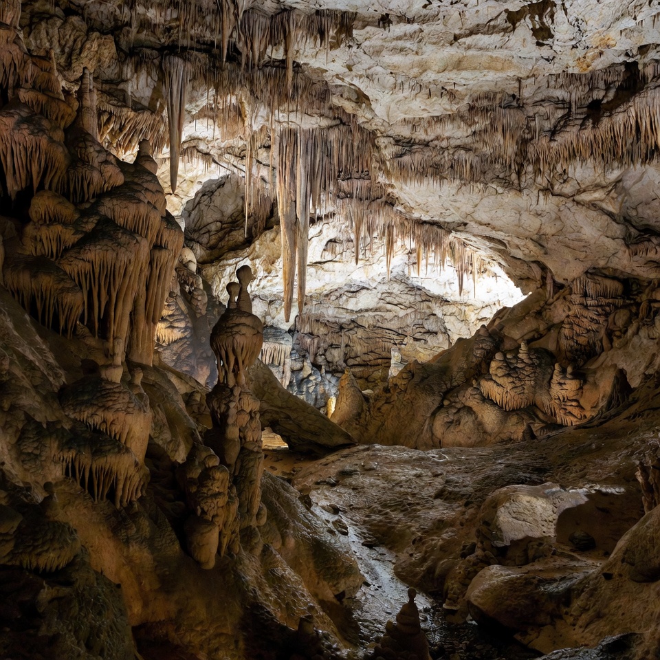 cave interior, cavern, dripstone, earthy tones, exploration, geology, illuminated cave, karst, limestone, mineral deposits, natural, rock formations, speleology, stalactites, stalagmites, underground, cave
