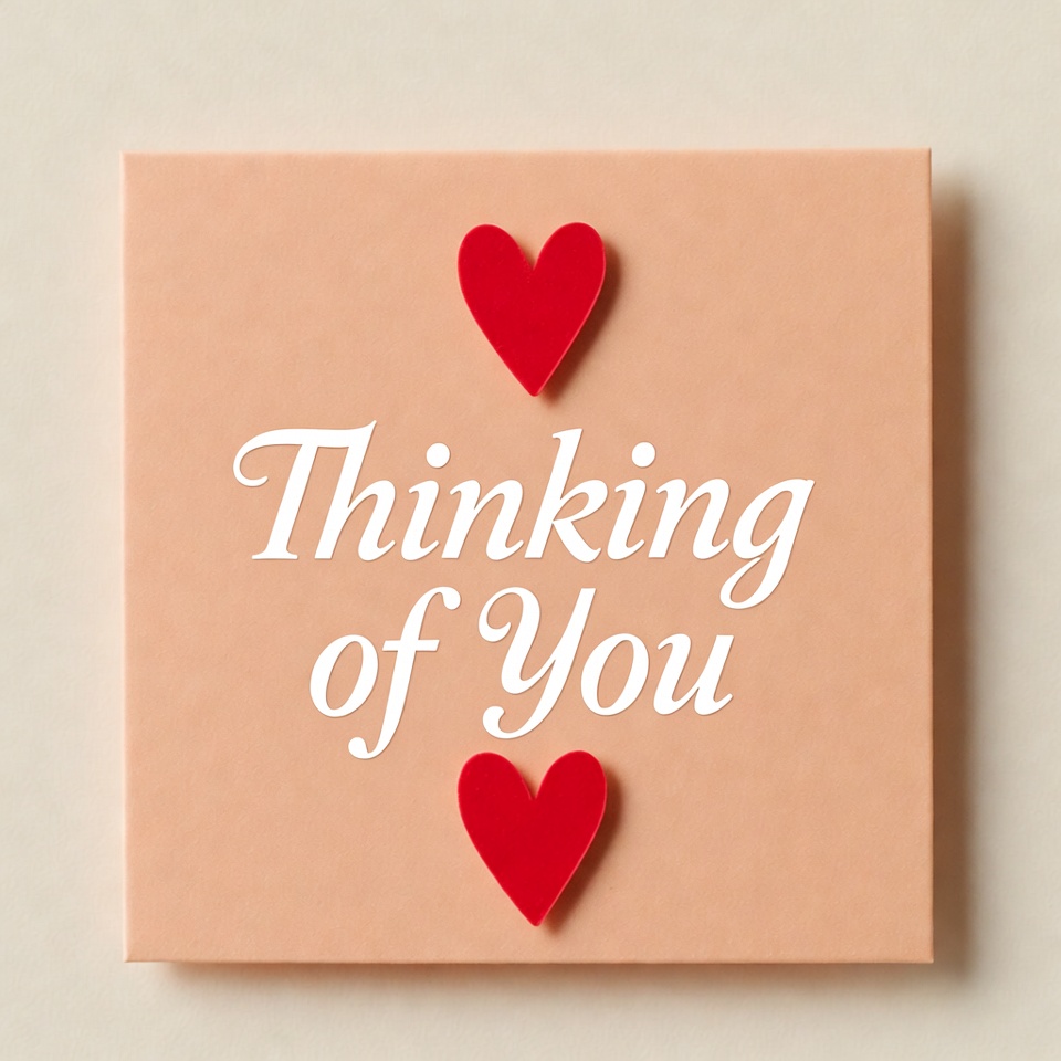 A square beige card features the text 'Thinking of You' in elegant white cursive font. Two pairs of red heart stickers are placed above and below the text. The card is isolated on a plain background.