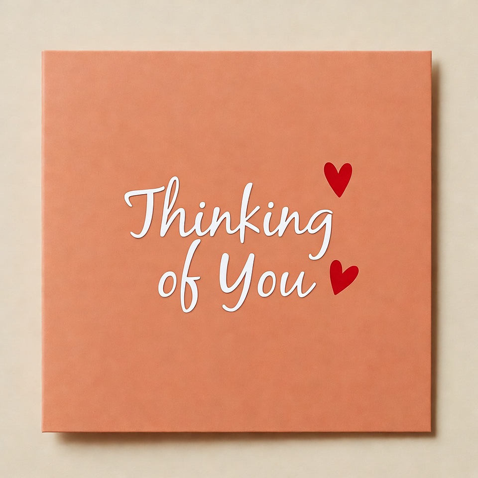 A square orange greeting card features the white text 'Thinking of You' in elegant cursive font. Red heart icons are placed next to the words. The card is shown slightly open against a light background.