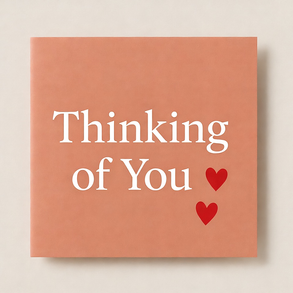 A square card features a peach-colored background with the white text 'Thinking of You' in elegant font. Two red heart icons are positioned next to 'You'. The design is simple and clean against the solid background.