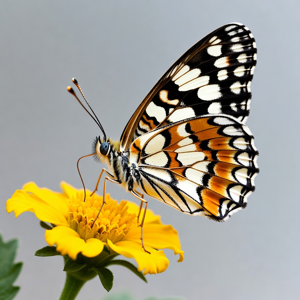 A butterfly with orange, white, and black wings perches on a bright yellow flower. Its wings feature intricate spotted patterns and are partially spread open. The flower stem is green against a light gray background.