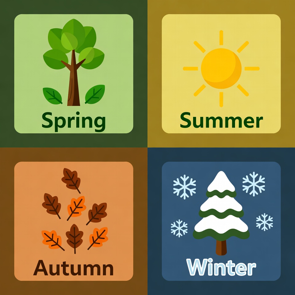 A colorful illustration features four squares representing the seasons. Spring shows a green tree on a light green background, summer a yellow sun on yellow, autumn orange falling leaves on orange, and winter a snow-covered tree with snowflakes on blue. Each square is labeled with the season name in bold text.