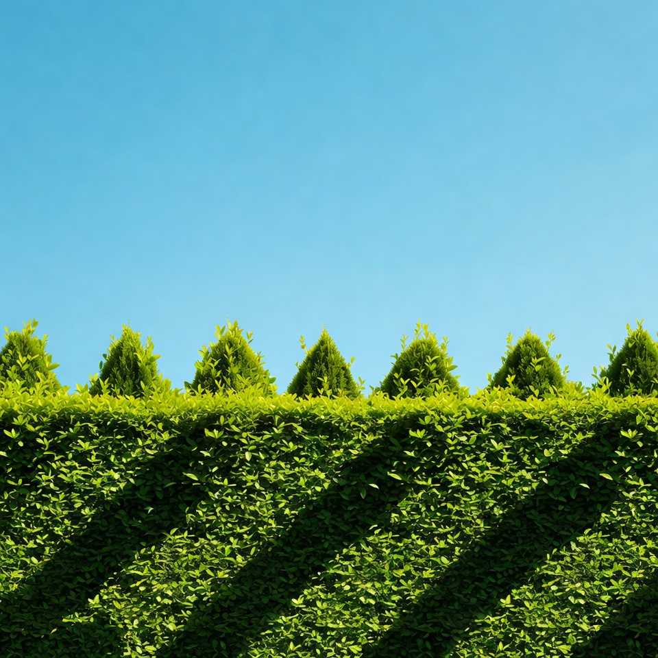 A row of neatly trimmed conical green hedges stands against a clear blue sky. Shadows from the hedges stretch across the dense green hedge base below. The vibrant foliage creates a striking contrast with the sky.