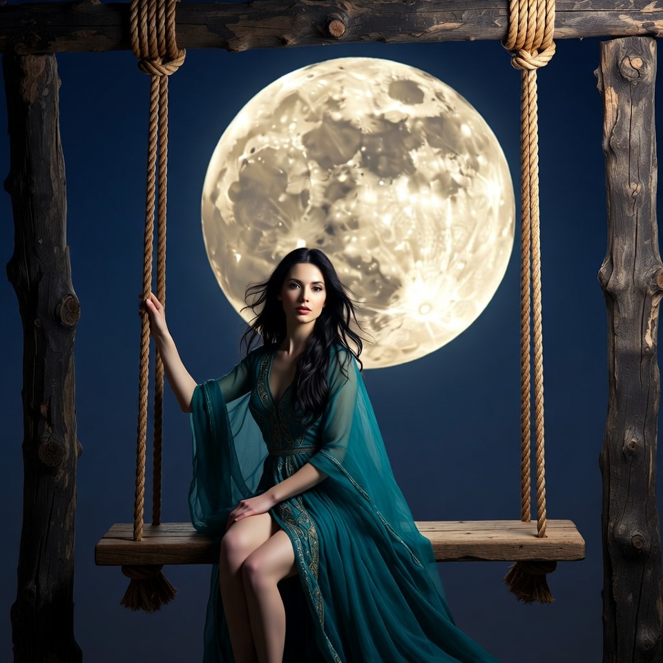 A woman with long dark hair sits on a wooden swing framed by ropes and rustic beams. She wears a flowing emerald green dress with slits revealing her legs and rests one hand on the ropes. A large full moon glows brightly in the dark night sky behind her.