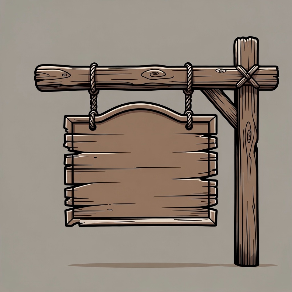 A hand-drawn illustration of a rustic wooden signboard hanging from a wooden post. The sign is blank with a curved top edge and suspended by ropes tied to a crossbeam. It features a simple, isolated design on a gray background.