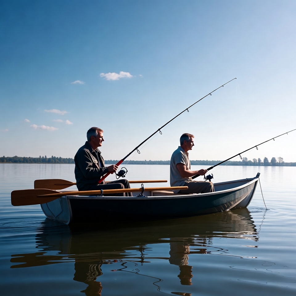Two middle-aged White men sit in a small rowboat on a calm lake, holding fishing rods with lines cast into the water. One man wears a gray jacket and the other a light shirt, with oars resting in the boat. The scene features a clear blue sky, scattered clouds, and distant trees reflected on the water.