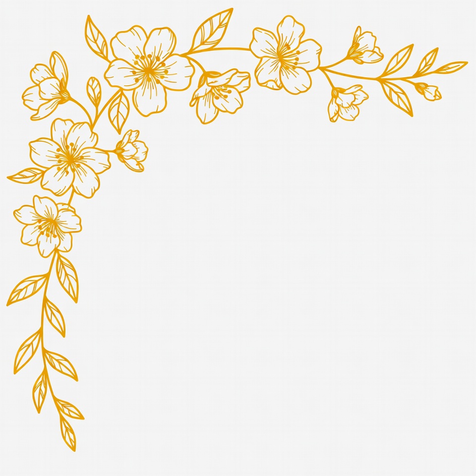 blossoms, botanical design, clipart, corner border, corner design, decorative border, elegant flowers, floral border, floral illustration, flower arrangement, flowers, golden, illustration, leaves, line art, outline, stems, transparent background, vector art, yellow, golden flowers