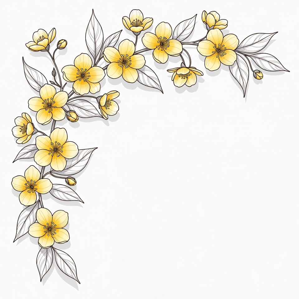 border illustration, botanical illustration, clipart, corner design, decorative flowers, floral border, floral clipart, flower branch, flower buds, flowers, hand drawn flowers, illustration, isolated background, line art, outline flowers, spring flowers, vector flowers, white leaves, yellow blossoms, yellow flowers