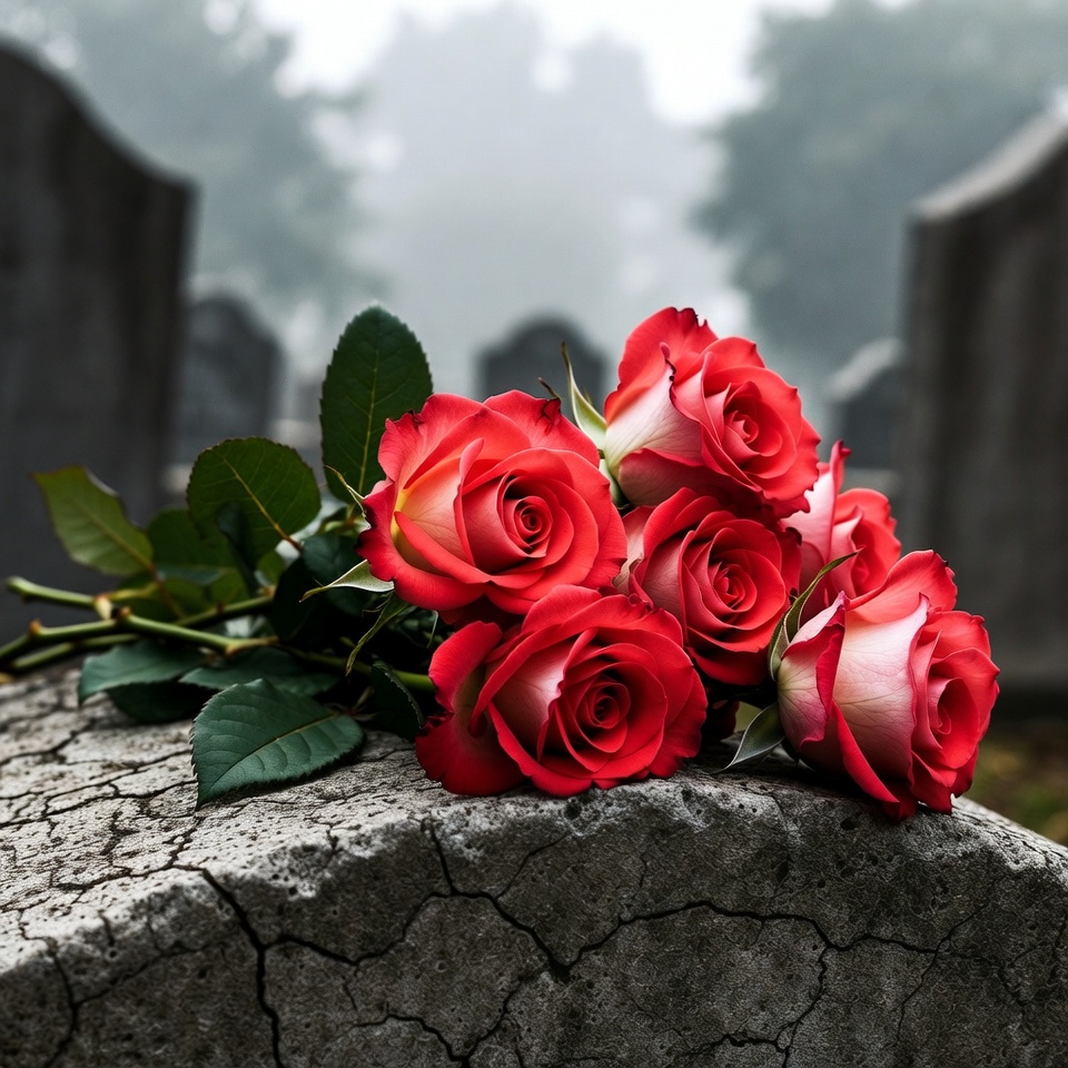 A bouquet of vibrant red roses with green leaves rests on a weathered gray gravestone. Foggy background features blurred cemetery headstones and trees. The roses are arranged in a cluster, some with white edges on petals.