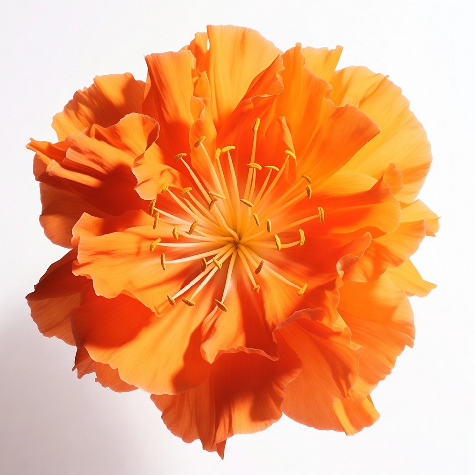 bloom, botany, bright orange, closeup, floral, flower, flower head, full bloom, garden flower, isolated, macro, nature, petals, ruffled petals, stamens, vibrant, white background, yellow center, orange flower