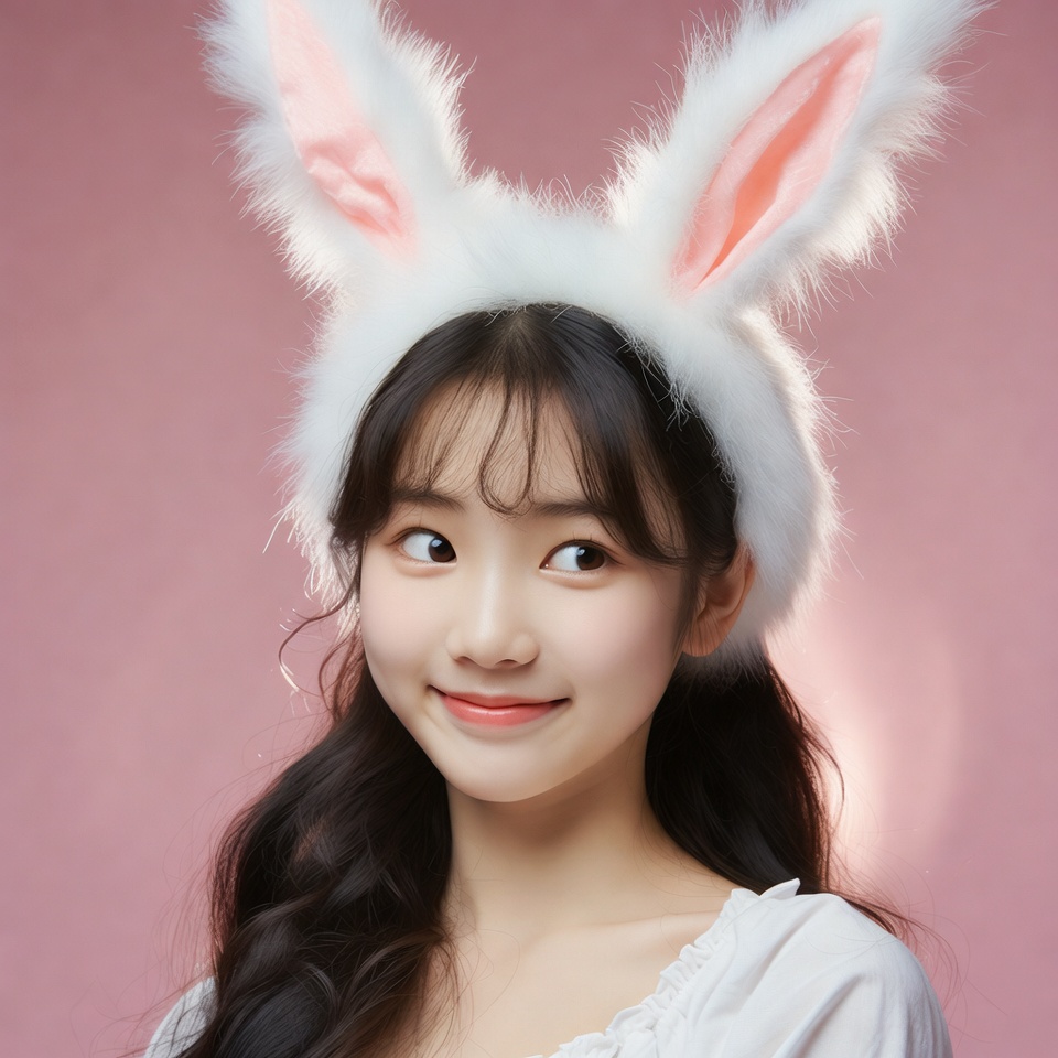 A young Asian woman with long dark wavy hair smiles at the camera while wearing fluffy white bunny ears headband. She has a cute expression with wide eyes and is dressed in a white lace top. The image features a soft pink background.