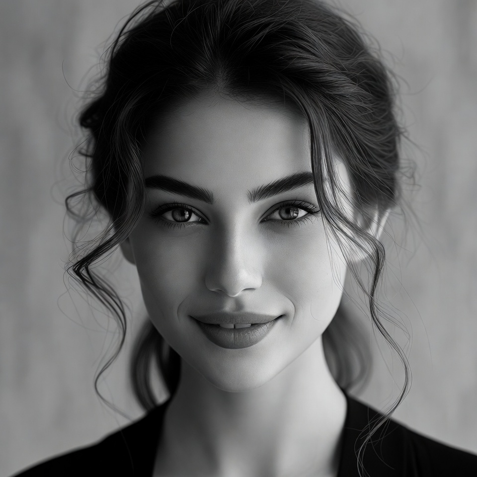 A young woman with long dark wavy hair styled in a loose updo smiles softly at the camera. Her face features prominent cheekbones, full lips, and expressive green eyes. She wears a dark blazer collar against a neutral gray background in this black and white portrait.
