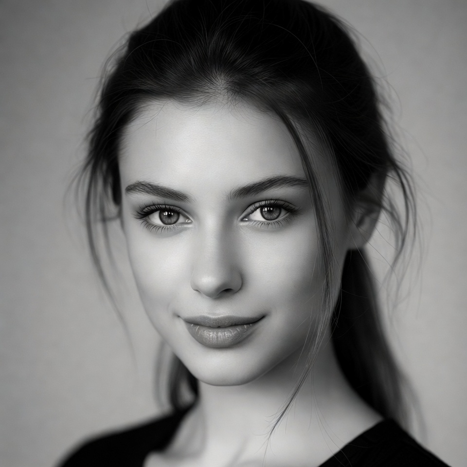 A young woman with long dark hair tied in a ponytail gazes directly at the camera in a black and white portrait. Her large expressive eyes and subtle smile are highlighted against a plain background. She wears a dark top with loose strands of hair framing her face.