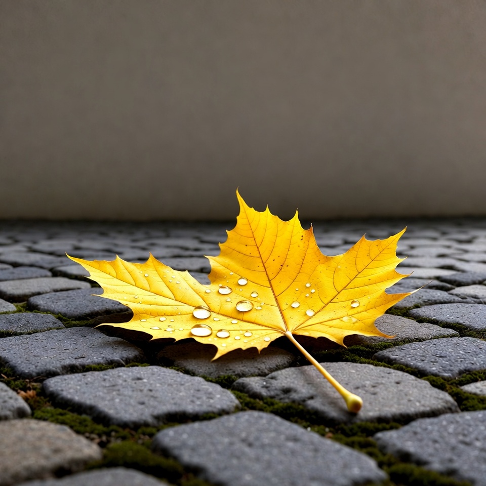 autumn leaf, cobblestone, dew drops, fall foliage, isolated background, leaf texture, macro photography, nature, pointed leaves, stone pavement, water droplets, yellow leaf, maple leaf
