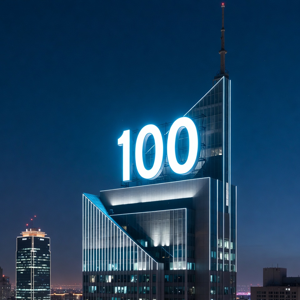 100 sign, angular design, architecture, blue lights, blue neon, city lights, cityscape, dark sky, futuristic tower, glass facade, glowing letters, high-rise building, illuminated sign, modern building, neon illumination, night city, night view, skyscraper, top sign, urban skyline