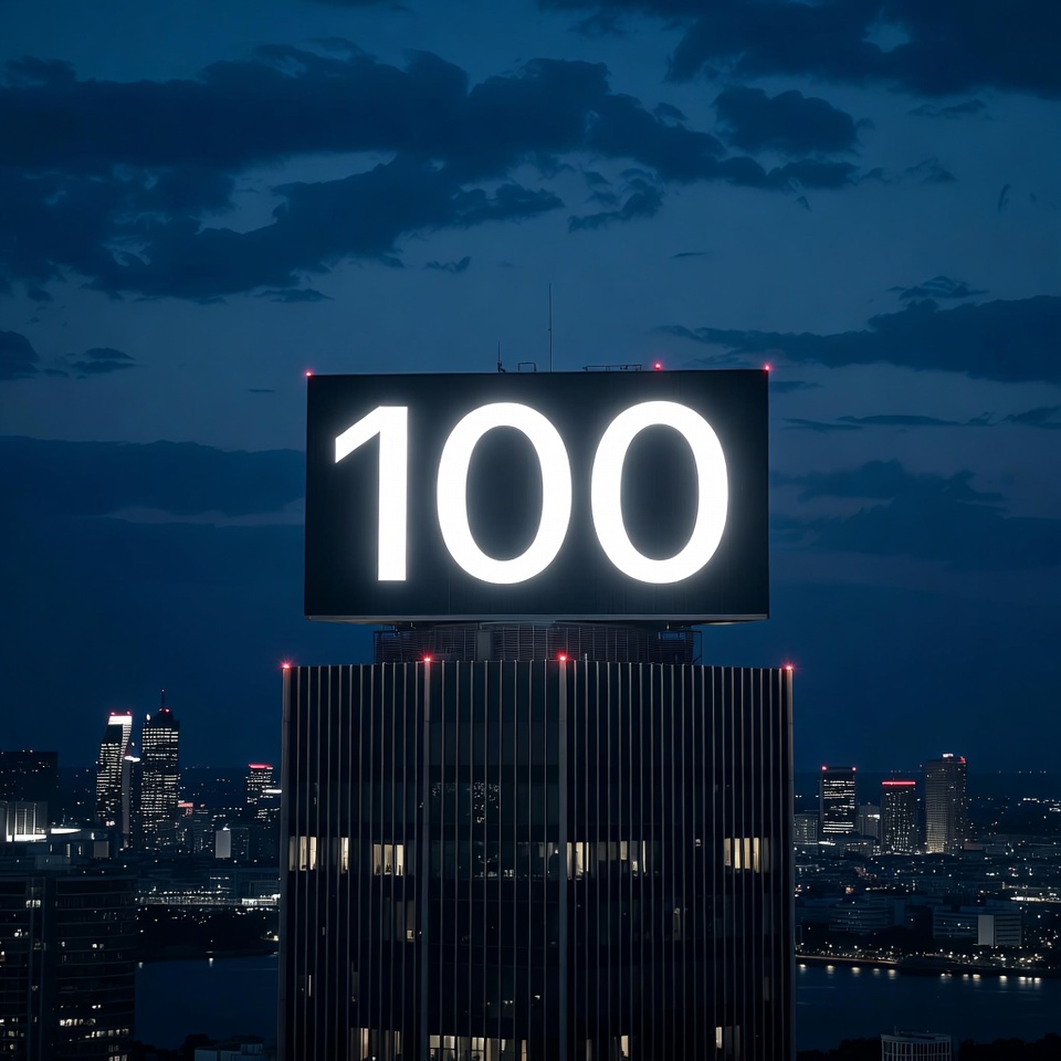 architecture, city lights, city skyline, clouds, digital display, evening cityscape, glowing number, high-rise, illuminated display, lit sign, metropolis, neon sign, night city, number 100, rooftop sign, skyscraper, tall building, twilight sky, urban landscape, waterfront skyline, 100 sign