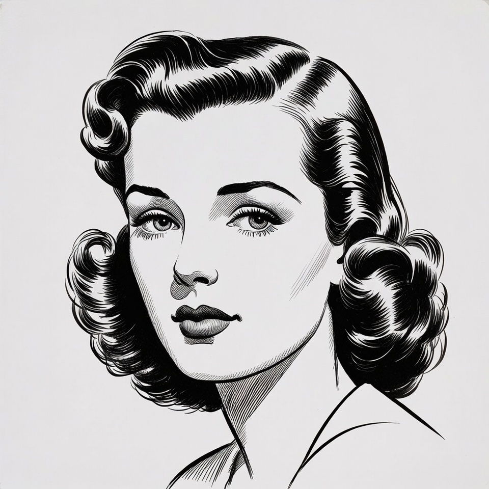 Black and white ink illustration of a woman with a classic 1940s curly hairstyle. She faces slightly to the side with a subtle smile, almond-shaped eyes, and full lips. Her hair features voluminous waves and curls framing her face against a plain background.