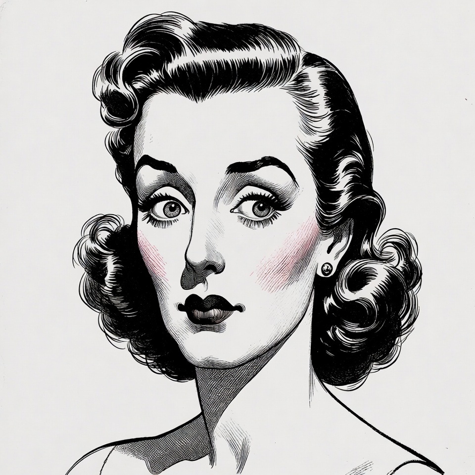 1940s hairstyle, White, black and white, cartoon woman, comic art, curly hair, exaggerated eyes, female, ink illustration, isolated background, line art, pearl earrings, pink blush, portrait, red lips, retro style, surprised expression, victory rolls, wide eyes, vintage woman
