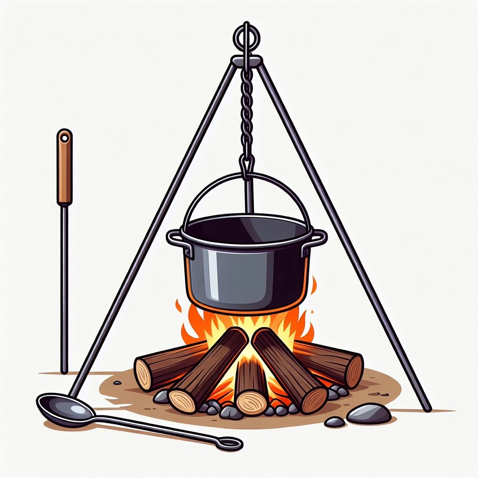 camp cooking, camping, cast iron pot, clipart, cooking, dirt ground, fire, flames, illustration, isolated background, ladle, logs, metal tripod, outdoor, pot, rocks, tripod, vector art, wooden ladle, campfire