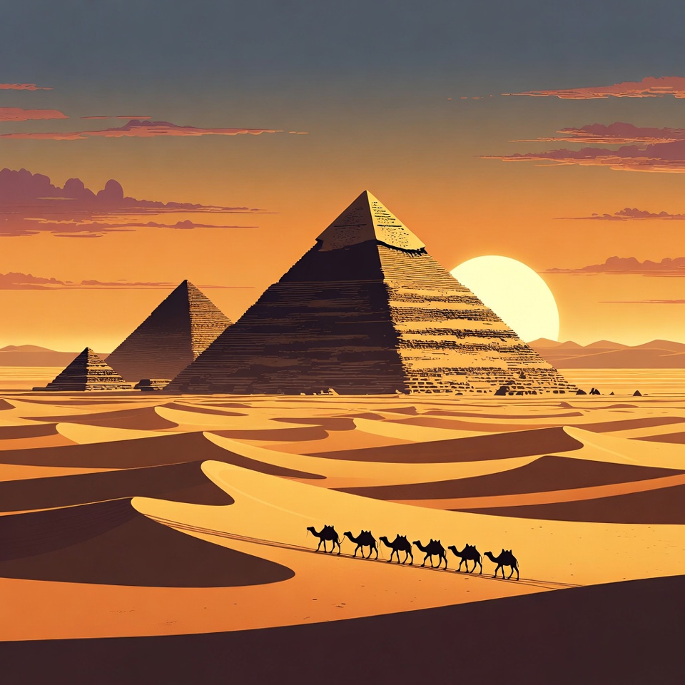 An illustration depicts the Great Pyramids of Giza silhouetted against a vibrant orange sunset sky. A line of camels walks across golden sand dunes in the foreground. Smooth, stylized shapes emphasize the desert landscape and ancient structures.