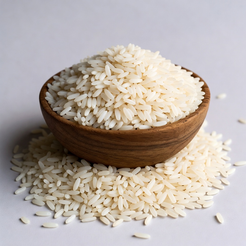 A wooden bowl filled with uncooked white rice sits on a white surface. Some rice grains spill over the edges of the bowl onto the surface below. The rice is long-grain and appears fresh and clean.