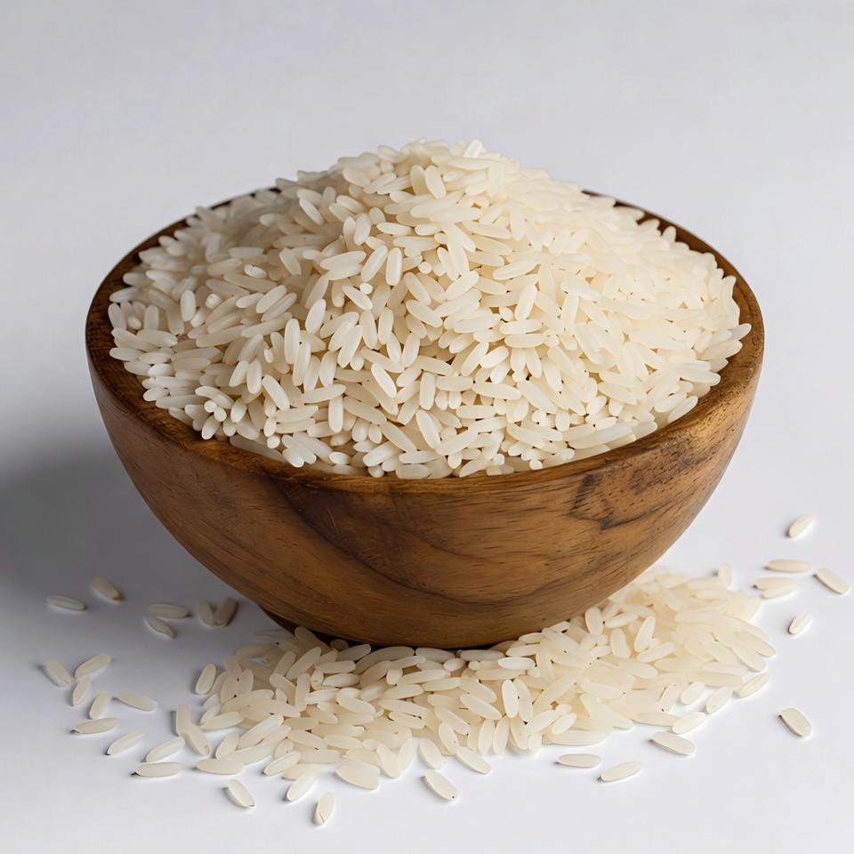 A wooden bowl filled with uncooked white rice grains sits on a white background. Some rice grains spill over the edge of the bowl onto the surface below. The rice appears fresh and fluffy.