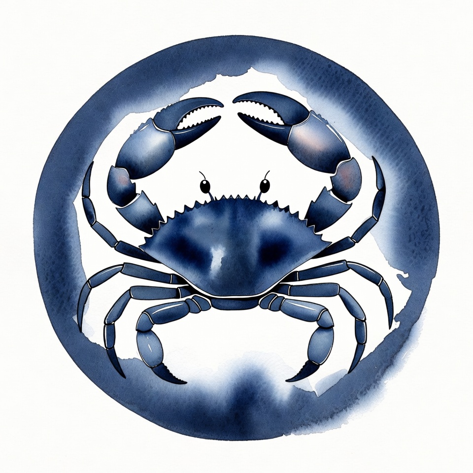 animal, blue crab, cancer zodiac, circular frame, claws, clipart, illustration, isolated background, legs, marine animal, navy blue, sea creature, watercolor, white background, zodiac, crab