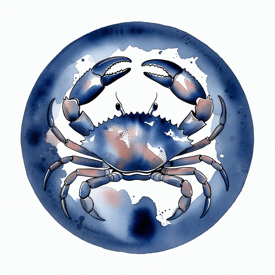 animal, aquatic, art, blue crab, circular, claws, crustacean, drawing, graphic, illustration, isolated background, marine, navy blue, ocean, painting, seafood, splatter, tattoo style, watercolor, crab