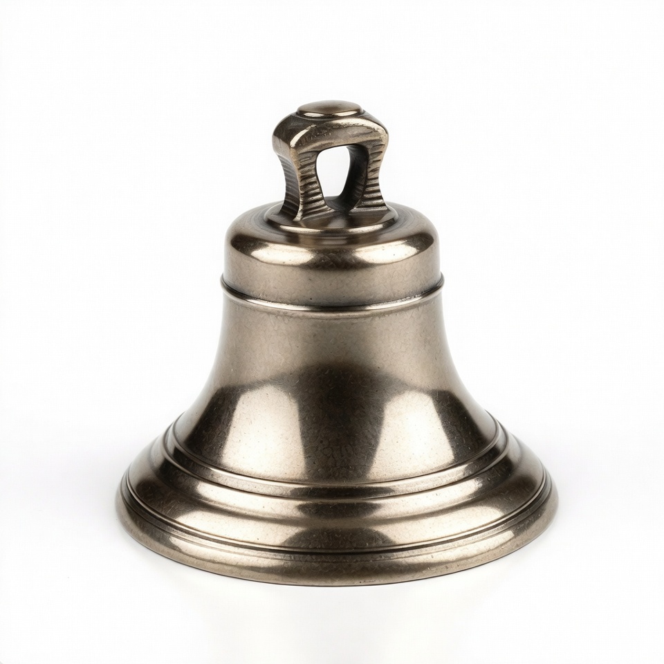 A polished bronze bell with a looped handle sits on a plain white background. The bell features a detailed clapper inside and an ornate base. Its metallic surface reflects light, highlighting the craftsmanship.