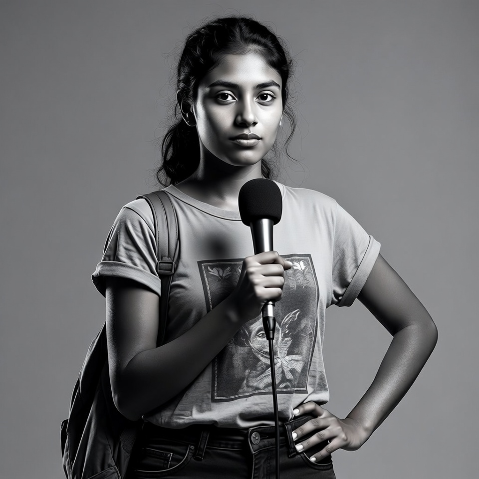 A young South Asian woman with dark hair tied in a ponytail stands confidently against a gray background, holding a black microphone in her right hand. She wears a loose gray t-shirt with a printed image of a fox-like creature holding a microphone, paired with slim jeans and a backpack slung over one shoulder. Her expression is neutral and poised, with hands positioned naturally at her sides.