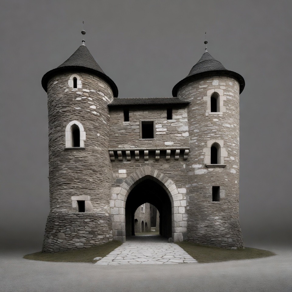 A medieval stone castle gate features two tall cylindrical towers with conical roofs and narrow windows. A large arched passageway leads through the center, flanked by cobblestone walls. The structure stands on a grassy area with a stone path leading to the entrance, set against a gray background.
