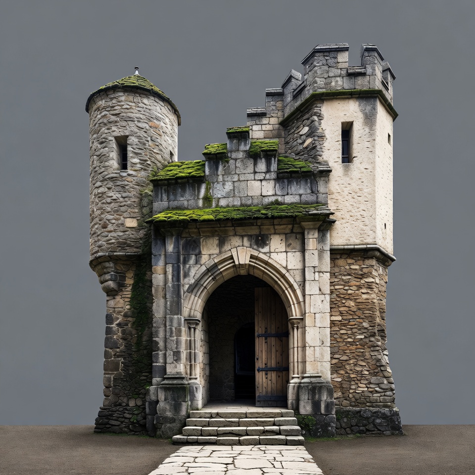 A detailed stone castle features two towers flanking a large arched wooden doorway with steps leading up to it. Moss and ivy cover parts of the weathered gray walls and green rooftops. The structure stands isolated against a plain gray background.