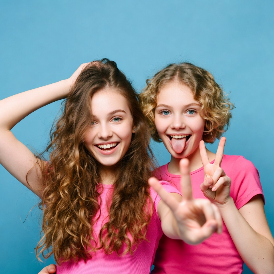 White, arms raised, blonde hair, blue background, brown hair, curly hair, cute girls, female, friends, hand gesture, happy girls, peace sign, pink t-shirt, playful, portrait, posing, short hair, smiling, studio photo, tongue out, two girls, wavy hair, young girls, girls