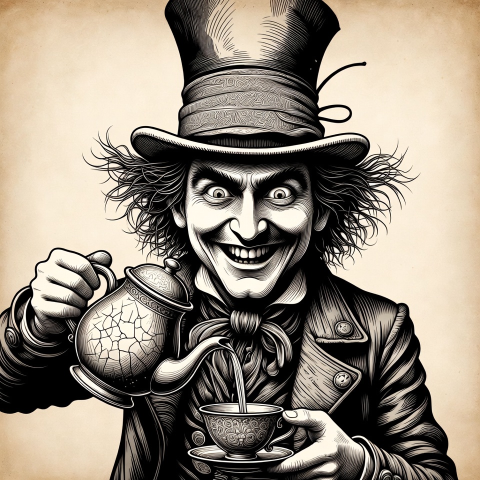 A creepy Mad Hatter with wild hair and top hat pours tea from a cracked teapot into a cup. He wears Victorian clothing with a bow tie and coat, grinning maniacally with wide eyes. The detailed ink drawing features a textured parchment background.
