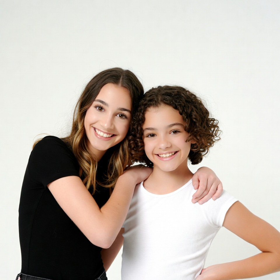 Two young girls stand closely together on a plain white background, with the older one hugging the younger from behind. The older girl has straight brown hair with highlights, wears a black t-shirt and dark pants, and smiles warmly. The younger girl has curly brown hair, wears a white t-shirt, and smiles happily with her arm extended.