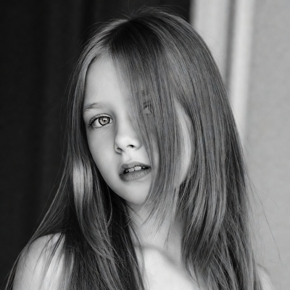 A young girl with long straight hair looks directly at the camera in a black and white portrait. Her hair partially covers one eye, and she has a subtle pout on her lips. The background features a dark curtain and light wall.