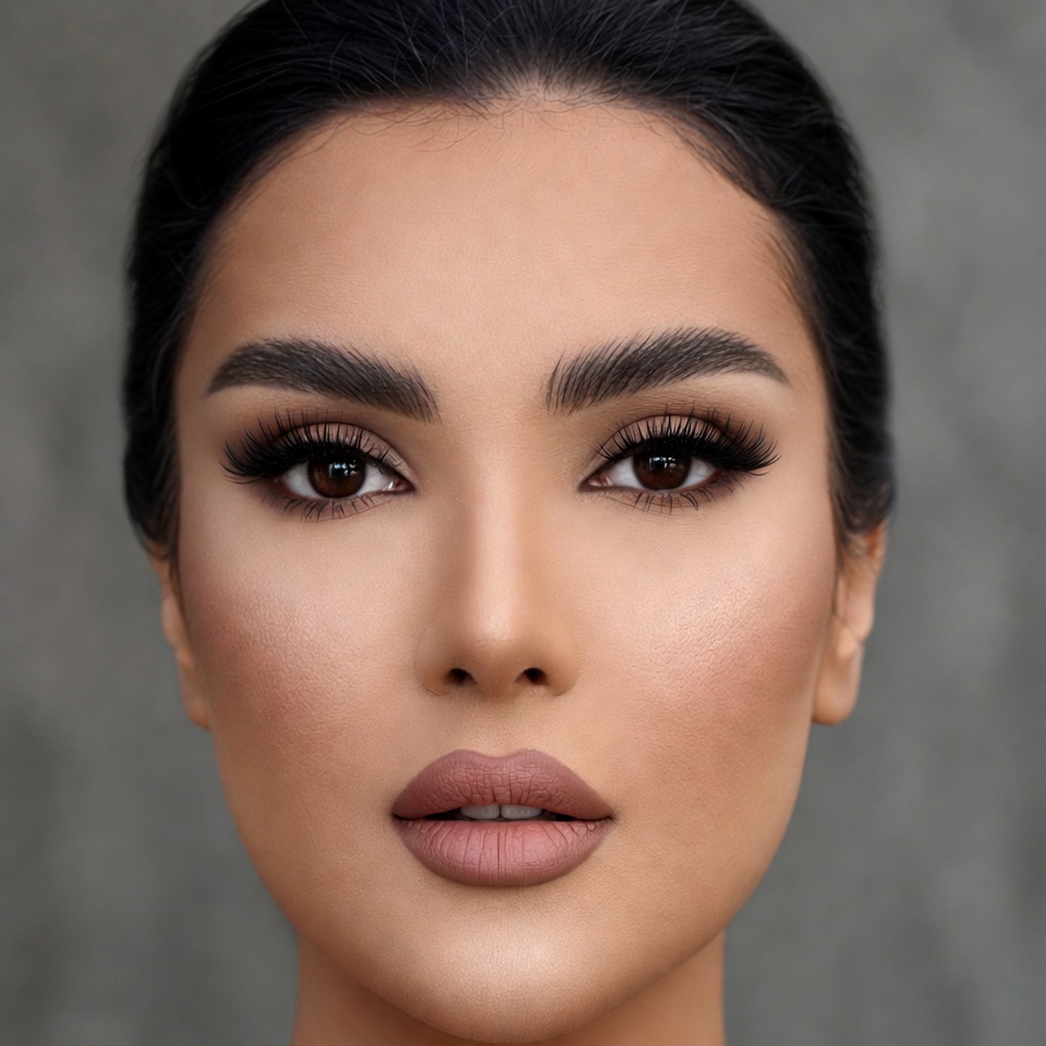 A young woman with long dark hair styled in an updo stares directly at the camera against a gray background. She has bold arched eyebrows, long false eyelashes, brown eyes, contoured cheeks, and full lips coated in nude lipstick. Her skin is smooth and highlighted for a glamorous look.