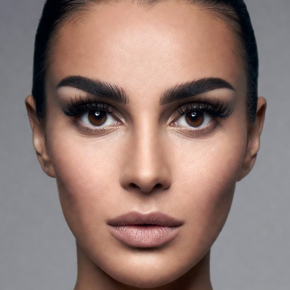 A woman with dark hair in a sleek bun stares directly at the camera in a closeup portrait. She has bold arched eyebrows, long dramatic eyelashes, brown eyes, and full nude lips. Her skin is smooth and the background is plain gray.