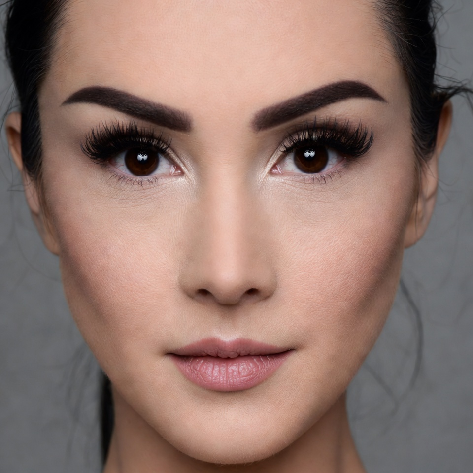 A young Asian woman with dark hair tied back stares directly at the camera in a close-up portrait. She has bold arched eyebrows, long dark eyelashes, brown eyes, and smooth fair skin. Her lips are lightly glossed in a subtle pink shade against a plain gray background.
